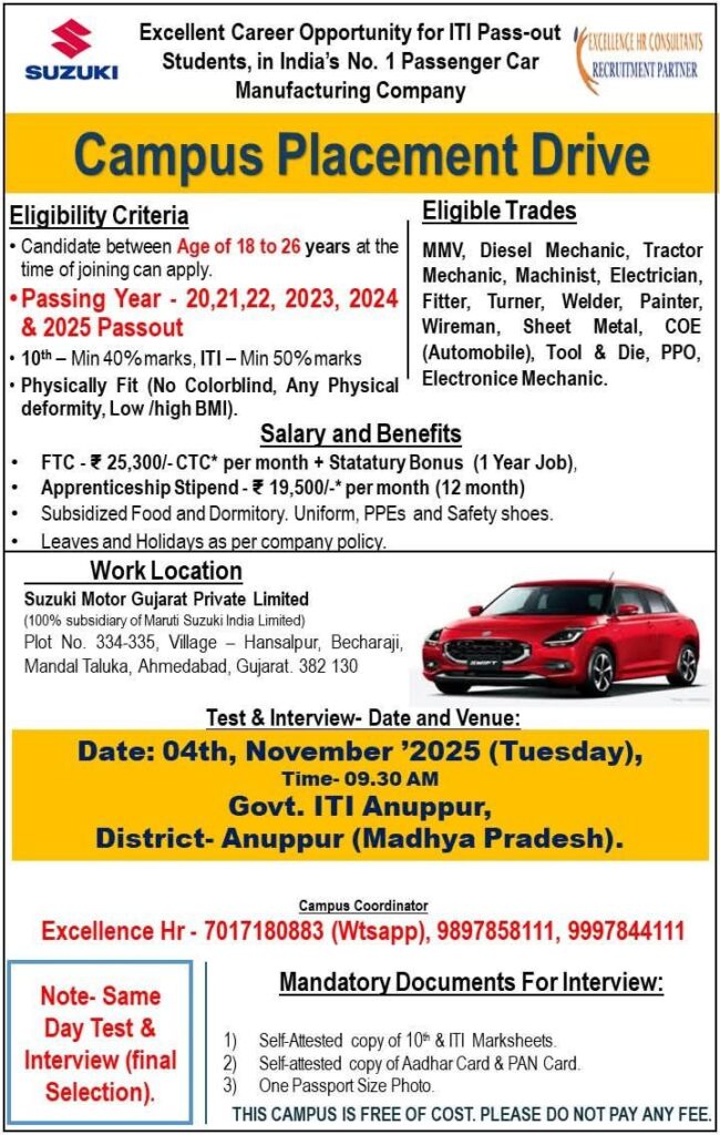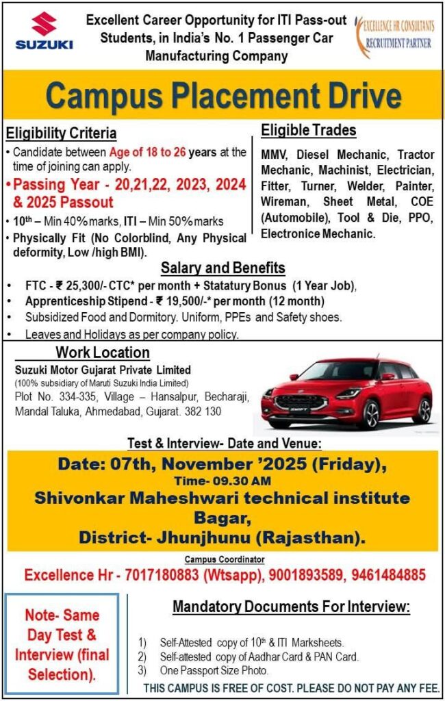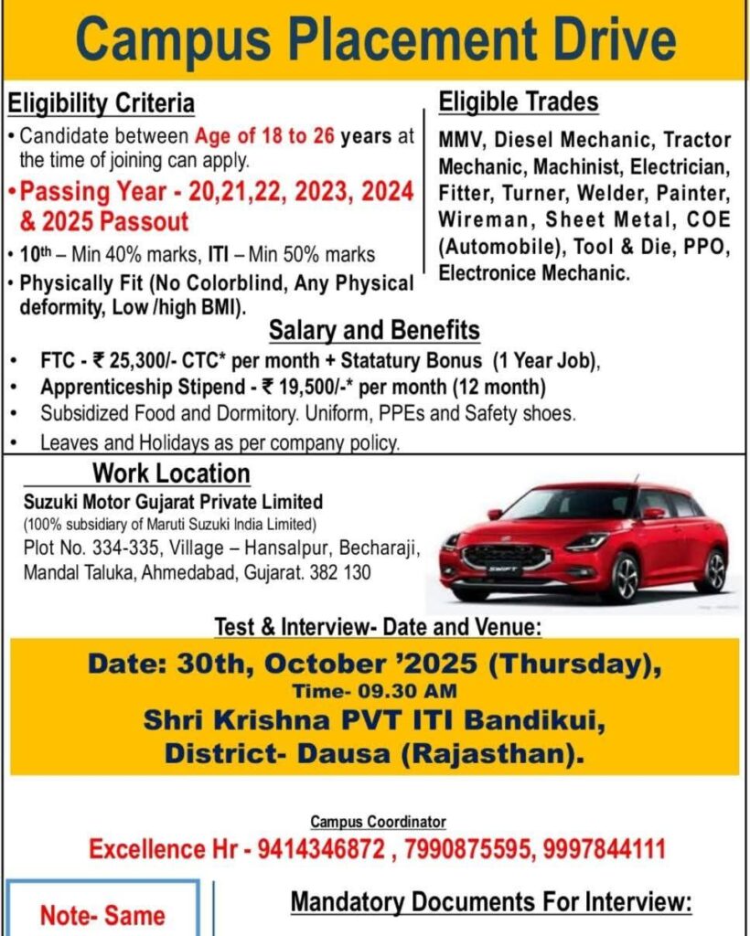उम्मीदवारों को समय पर पहुंचने और सभी आवश्यक दस्तावेज साथ लाने की सलाह दी जाती है। यह अवसर उन युवाओं के लिए है जो मारुति सुजुकी जैसी प्रतिष्ठित कंपनी में अपना करियर शुरू करना चाहते हैं।